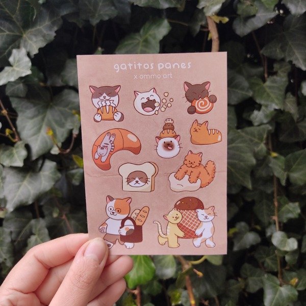 Plancha de stickers con 10 diseños de gatitos panes! Ya troquelada y lista para usar :)